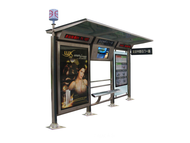 公交車候車亭一般是與公交站牌相配套的,為方便公交乘客候車時(shí)遮陽(yáng)、防雨等,在車站、道路兩旁或綠化帶的港灣式公交停靠站上建設(shè)的交通設(shè)施。由于城市公交的日益發(fā)達(dá),候車亭已發(fā)展成為城市一個(gè)不可或缺的重要組成部分,設(shè)計(jì)精美的候車亭也成為了城市一道美麗的風(fēng)景。 一般候車亭棚體主要頂棚、立柱、頂弓、廣告燈箱和坐凳組成,也有用隔板來(lái)代替廣告燈箱的。
