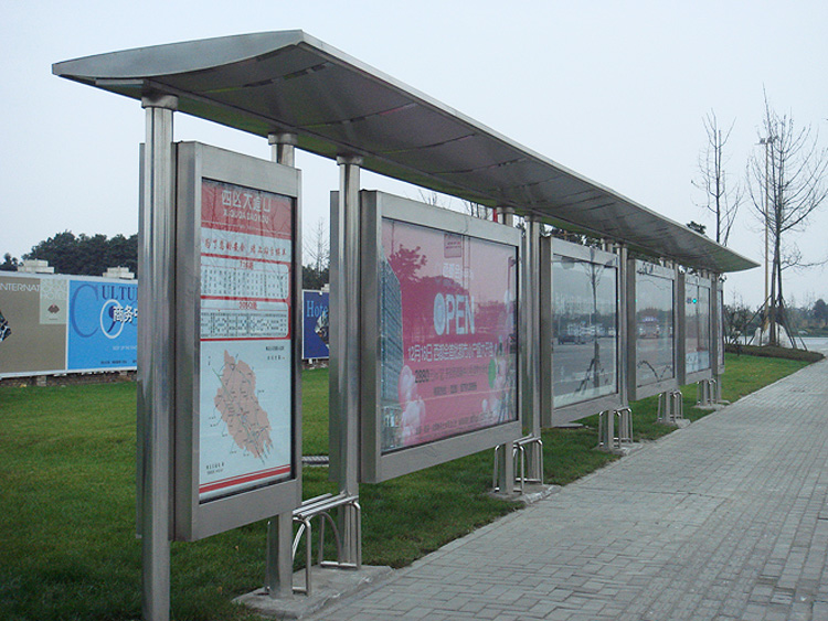 公交車候車亭一般是與公交站牌相配套的,為方便公交乘客候車時(shí)遮陽、防雨等,在車站、道路兩旁或綠化帶的港灣式公交停靠站上建設(shè)的交通設(shè)施。由于城市公交的日益發(fā)達(dá),候車亭已發(fā)展成為城市一個(gè)不可或缺的重要組成部分,設(shè)計(jì)精美的候車亭也成為了城市一道美麗的風(fēng)景。 一般候車亭棚體主要頂棚、立柱、頂弓、廣告燈箱和坐凳組成,也有用隔板來代替廣告燈箱的。